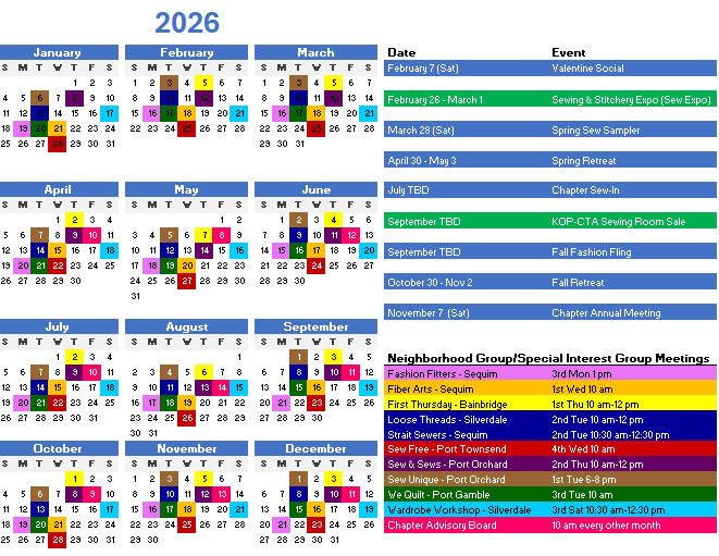 Our sister sewing organization – the Kitsap & Olympic Peninsula Clothing & Textile Advisors (or KOP-CTA for short) – is having their legendary annual Sewing Room Sale on Wednesday, September 10, 2025, 9:00 am – 3:00 pm, Kitsap County Fairgrounds President’s Hall, 1250 NW Fairgrounds Rd, Bremerton, WA 98311. For more details, head to the KOP-CTA website KOP-CTA.